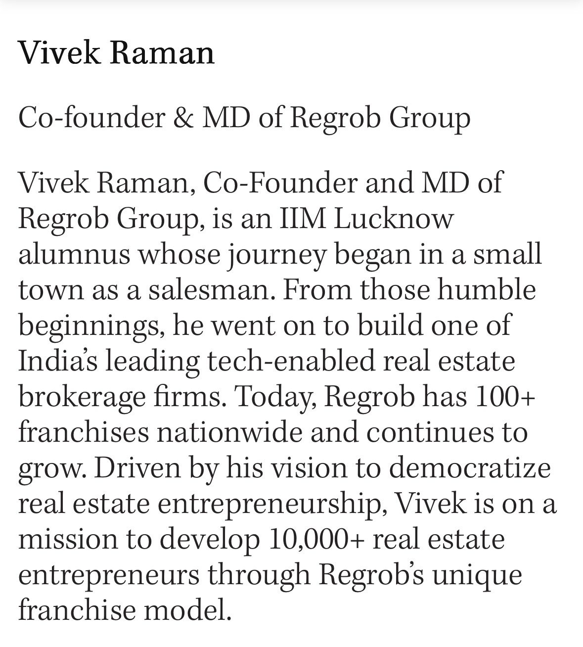 Vivek Raman’s journey is not built on privilege—but on persistence. Starting his career as a salesman, he transformed challenges into opportunities and went on to build Regrob, one of India’s leading tech-enabled real estate brokerage and franchise networks.